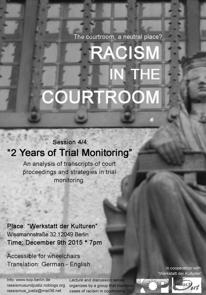 The event is organised by a group that monitors racism in the judiciary (Prozessbeobachtungs-gruppe Rassismus und Justiz), mainly in Berlin. We cooperate with ReachOut (counselling centre for victims of racist, right-wing extremist and anti-Semitic violence) and KOP (campaign for victims of racist police violence) and have regularly been observing trials for about two years.