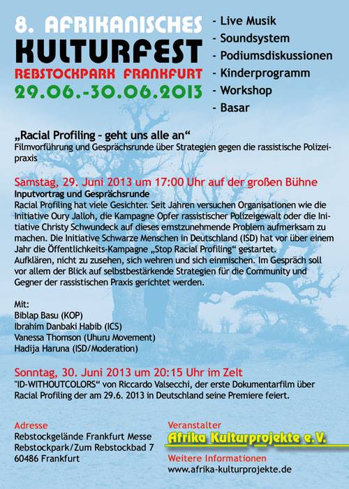 Aufklären, nicht zu zusehen, sich wehren und sich einmischen. Bei dem Inputvortrag und in der Gesprächsrunde am Samstag, 29. Juni 2013 um 17:00 Uhr auf der großen Bühne soll vor allem der Blick auf selbstbestärkende Strategien für die Community und Gegner der rassistischen Praxis gerichtet werden.